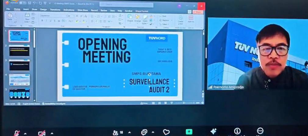 Audit dilakukan secara Online melalui media Zoom Meeting, kegiatan dimulai dengan sambutan oleh Ibu Sri Wahyuni selaku Kabag. Standarisasi & Ketaatan Yayasan. Dilanjutkan dengan penyampaian materi oleh Bapak Tommy selaku Auditor & Pendamping dari TUVNORD guna melakukan pemeriksaan dokumen administrasi Tim Manajemen Sekolah, kemudian melakukan observasi untuk langsung melihat proses pembelajaran yang berjalan di kelas dan melakukan wawancara terhadap Guru, Staf terkait penerapan manajemen mutu berlangsung dalam pembelajaran.